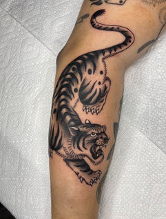 A Native Kansan, Emily has been tattooing professionally for seven years. Most of her career was spent in Atlanta, Georgia, where she developed a deep love for traditional tattooing. She enjoys creating lady heads, figures, flowers, and designs inspired by art history, working equally in color and black and gray. Clients praise her calm, kind demeanor, and she loves collaborating to bring ideas to life, ensuring each piece is personal and meaningful. When not in the studio, she spends time with her four cats, two guinea pigs, and dog.